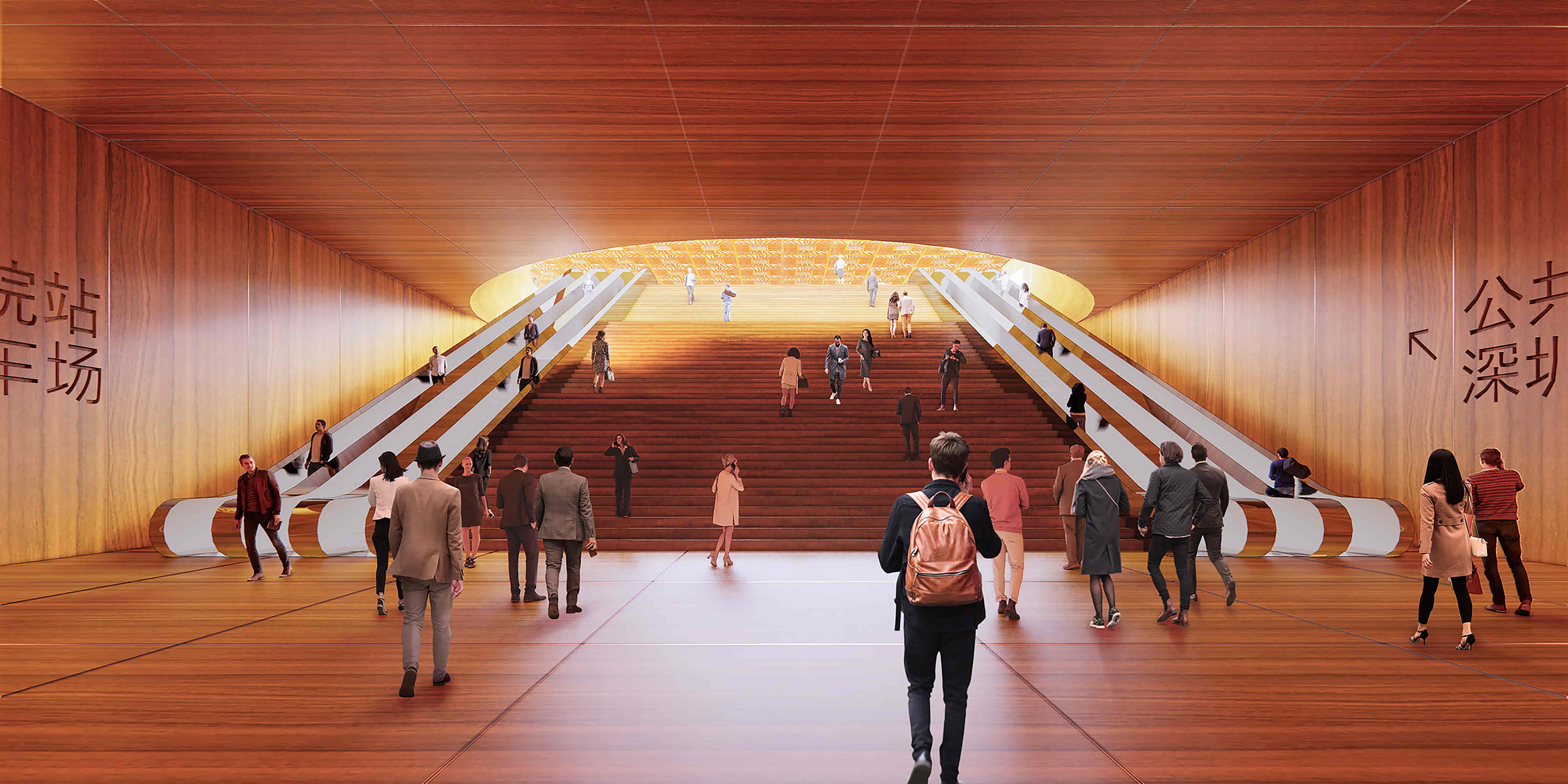 Whether on their way to a performance or a stroll through the park, visitors enter Shenzhen Opera House via a grand set of stairs and escalators that leads them from an underground pedestrian passage up to the luminous Gallery.