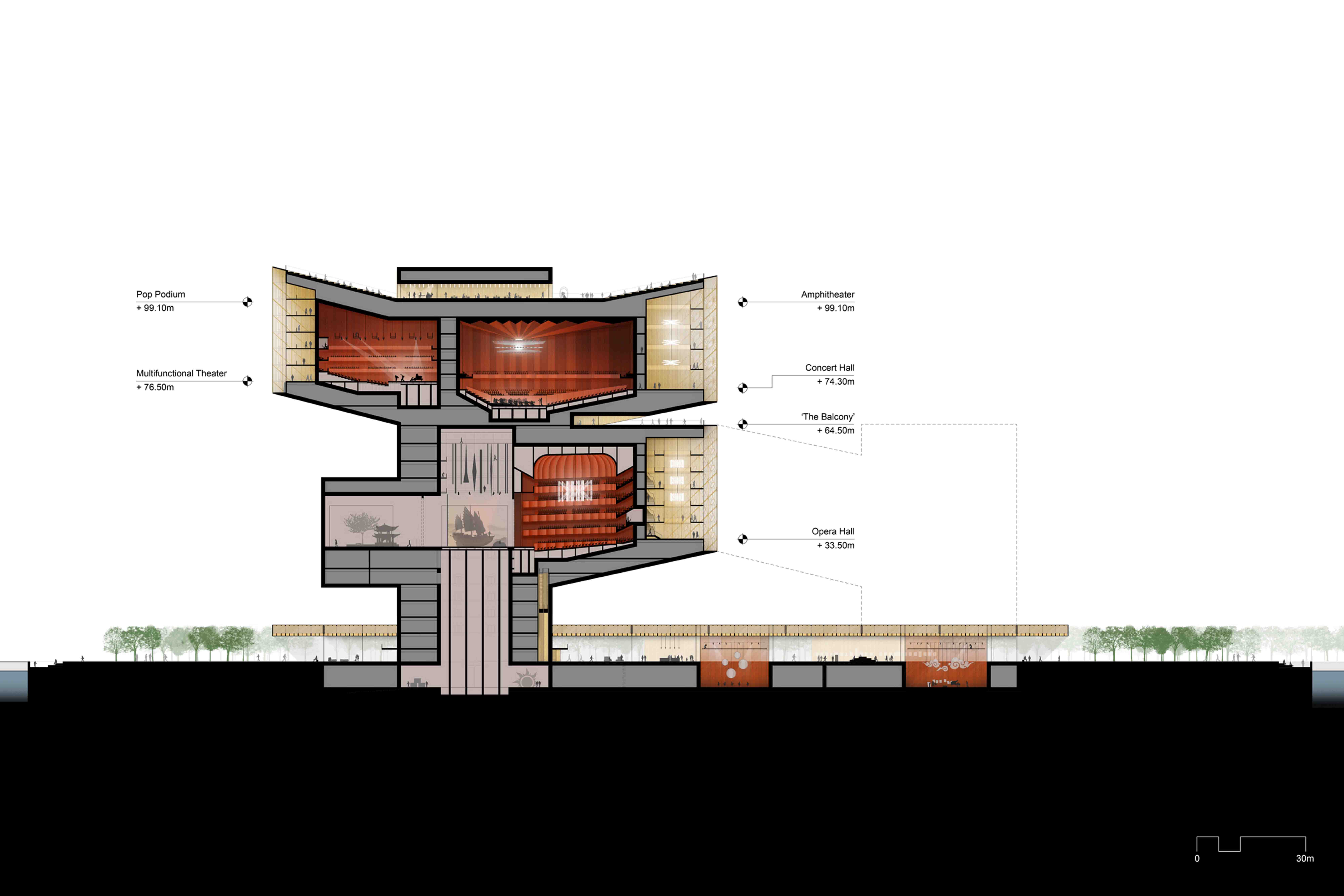 PROGRAM Performing arts complex (2,300-seat Opera Hall, 1,800-seat Concert Hall, 800-seat Operetta Hall, and 600-seat Multifunctional Theater); cultural center (Opera and Dance Literature Center, Stage Art Museum, Book Bar, and Public Hall); Urban Art Parlor; Opera Support Building; 1.7-hectare (4.1-acre) public park, and below-grade parking