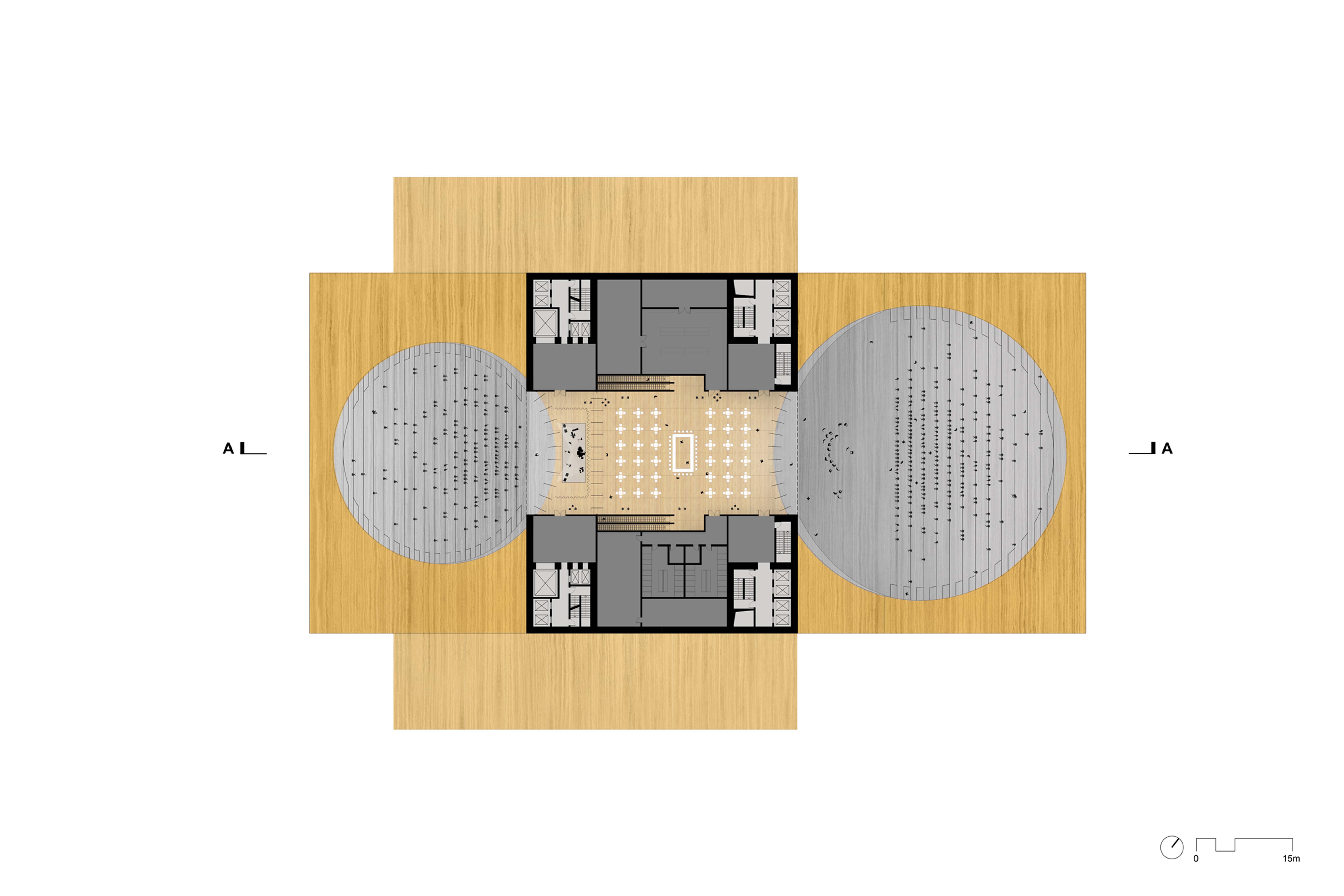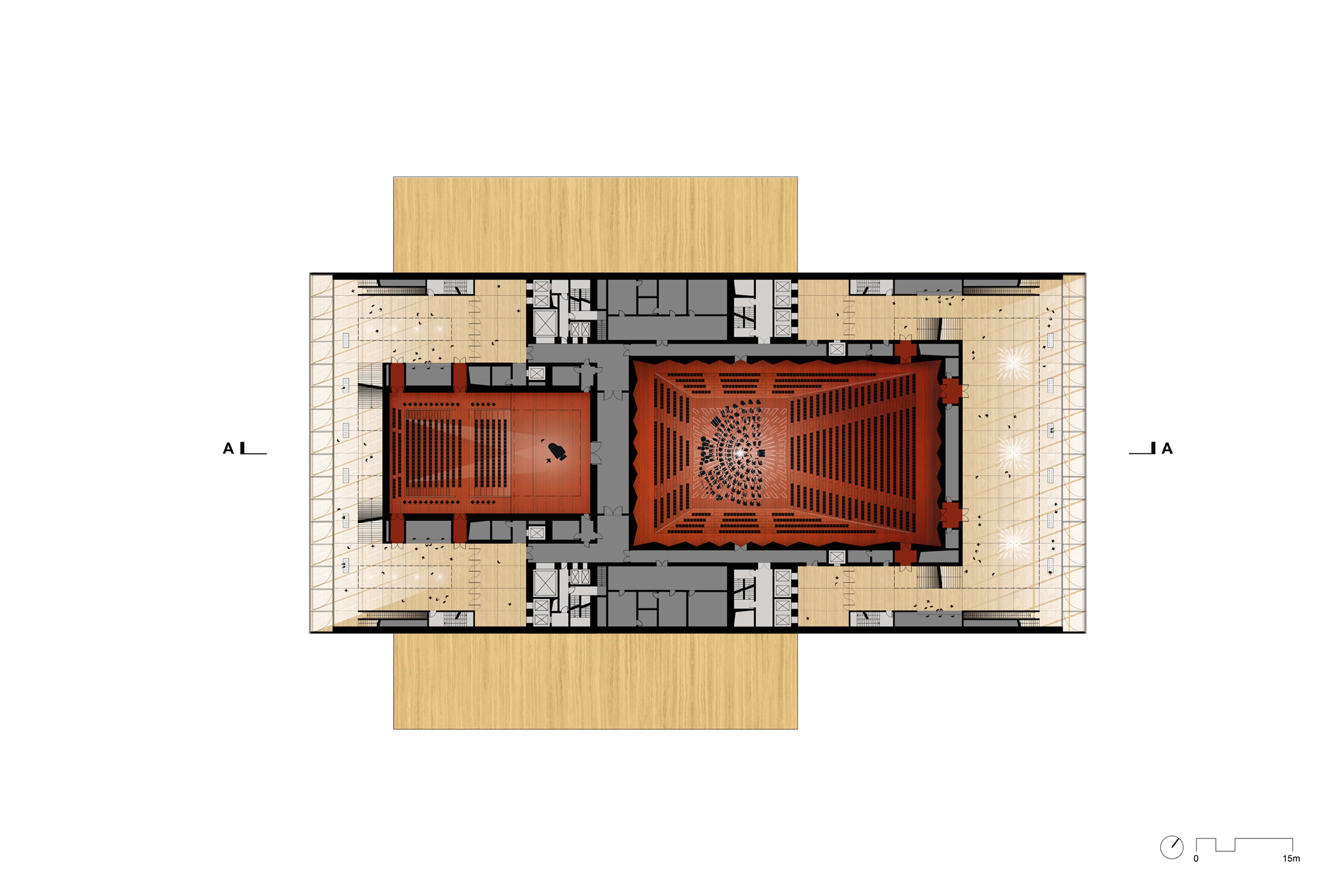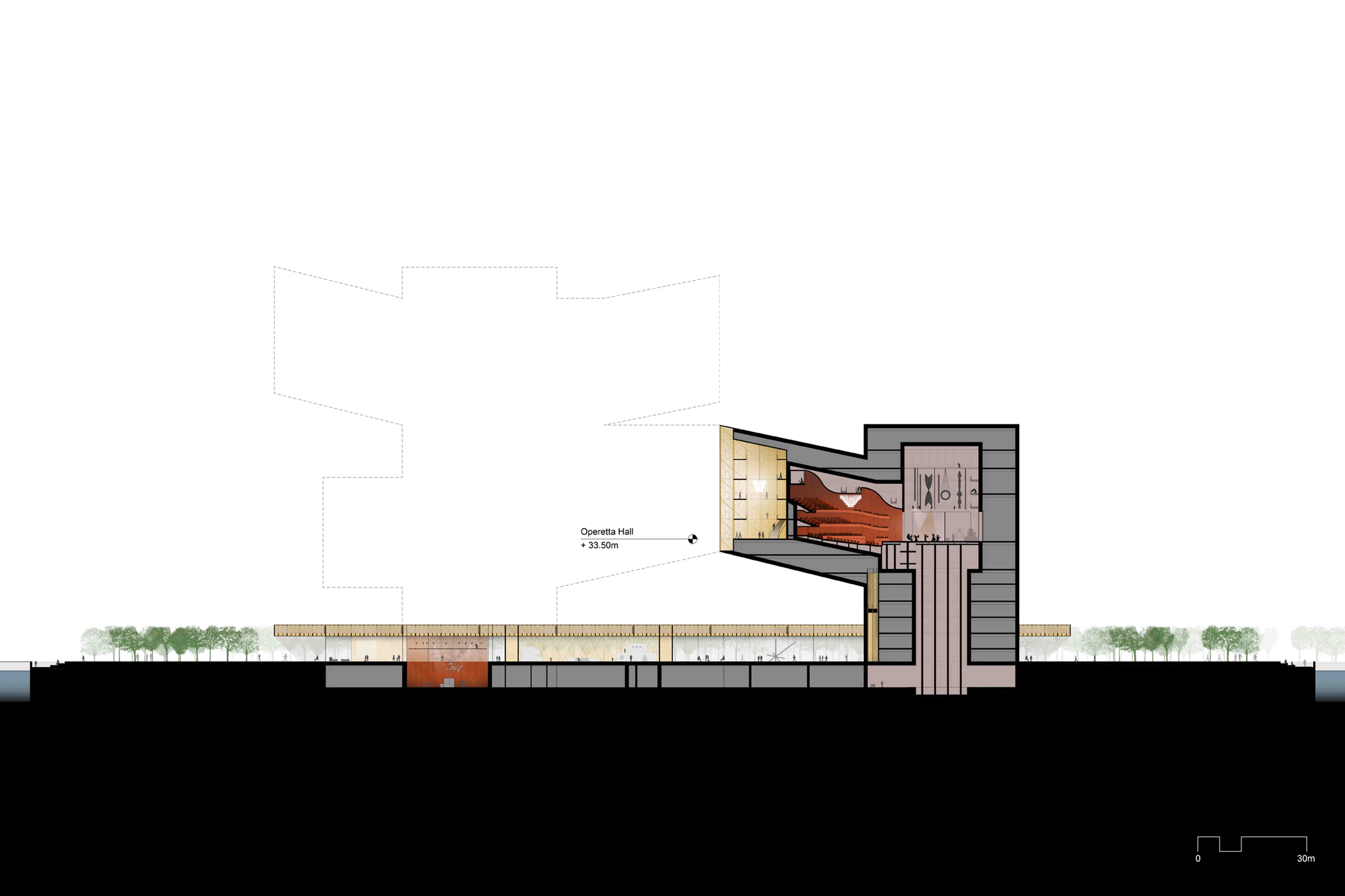 The Operetta Hall has been separated from the original stack to create a dynamic composition that fully activates the site. Like the Opera Hall, placing the Operetta Hall on grade now allows a massive stage elevator with direct access to the back-of-house services and loading docks on Level B1.