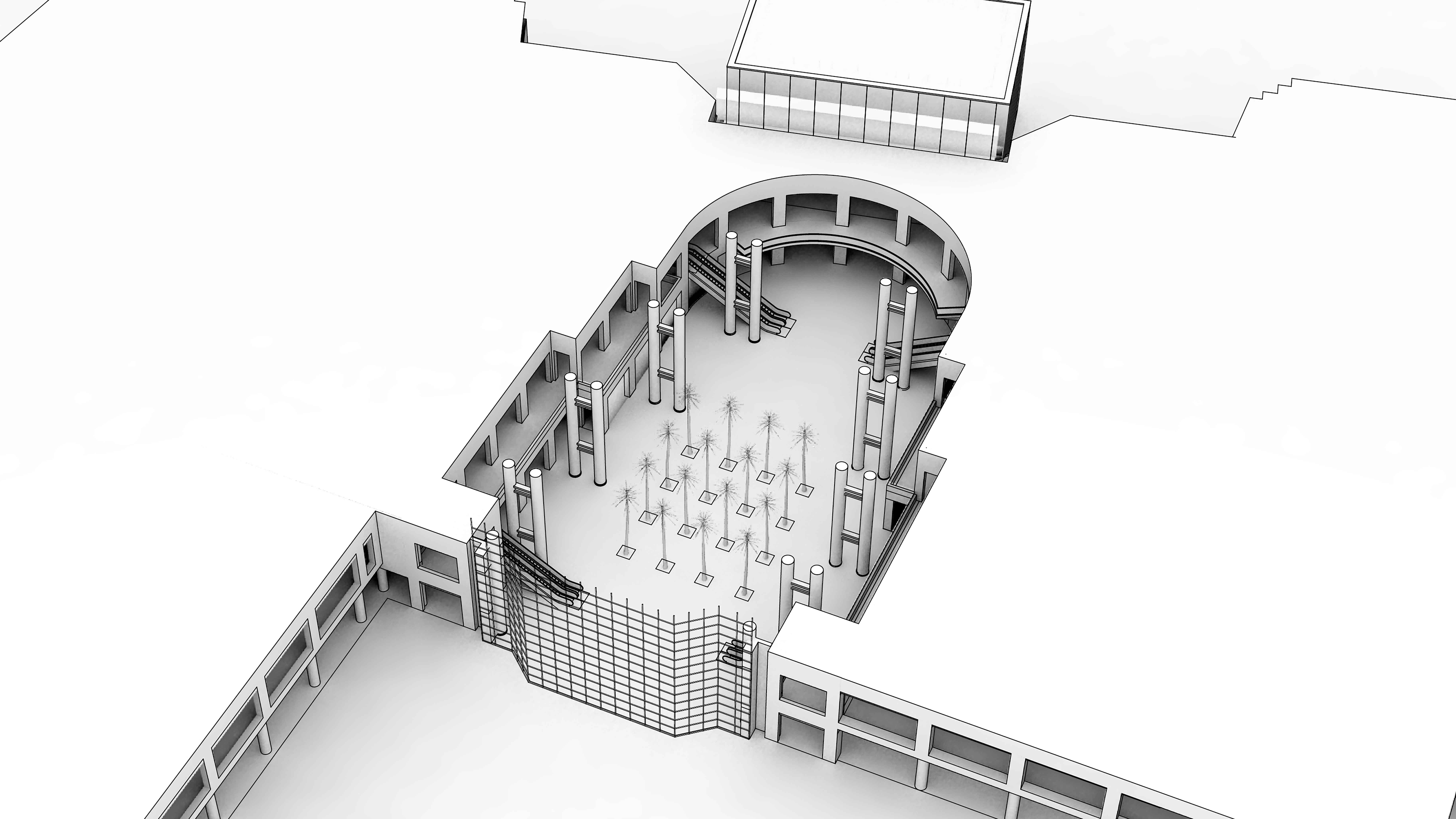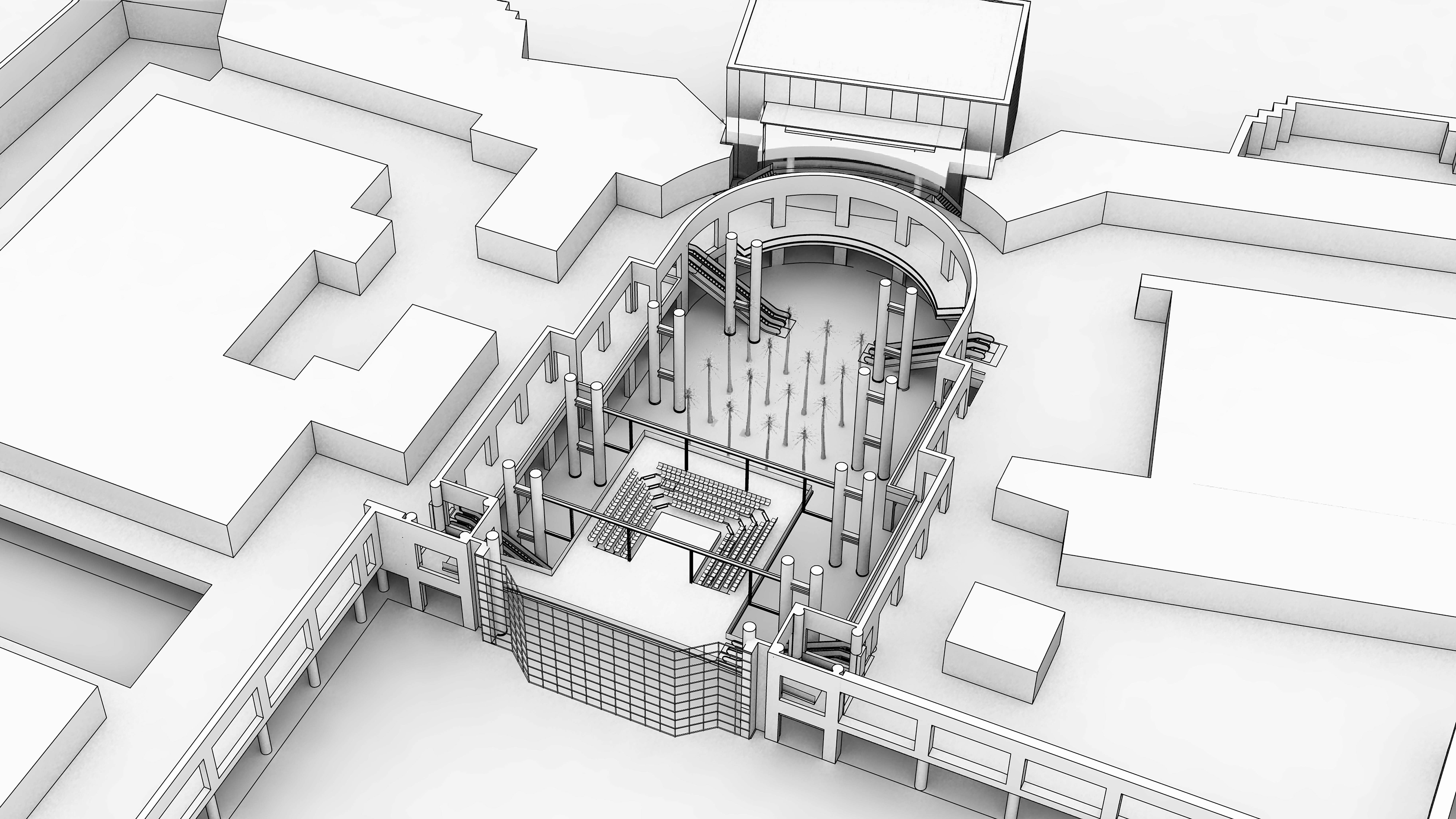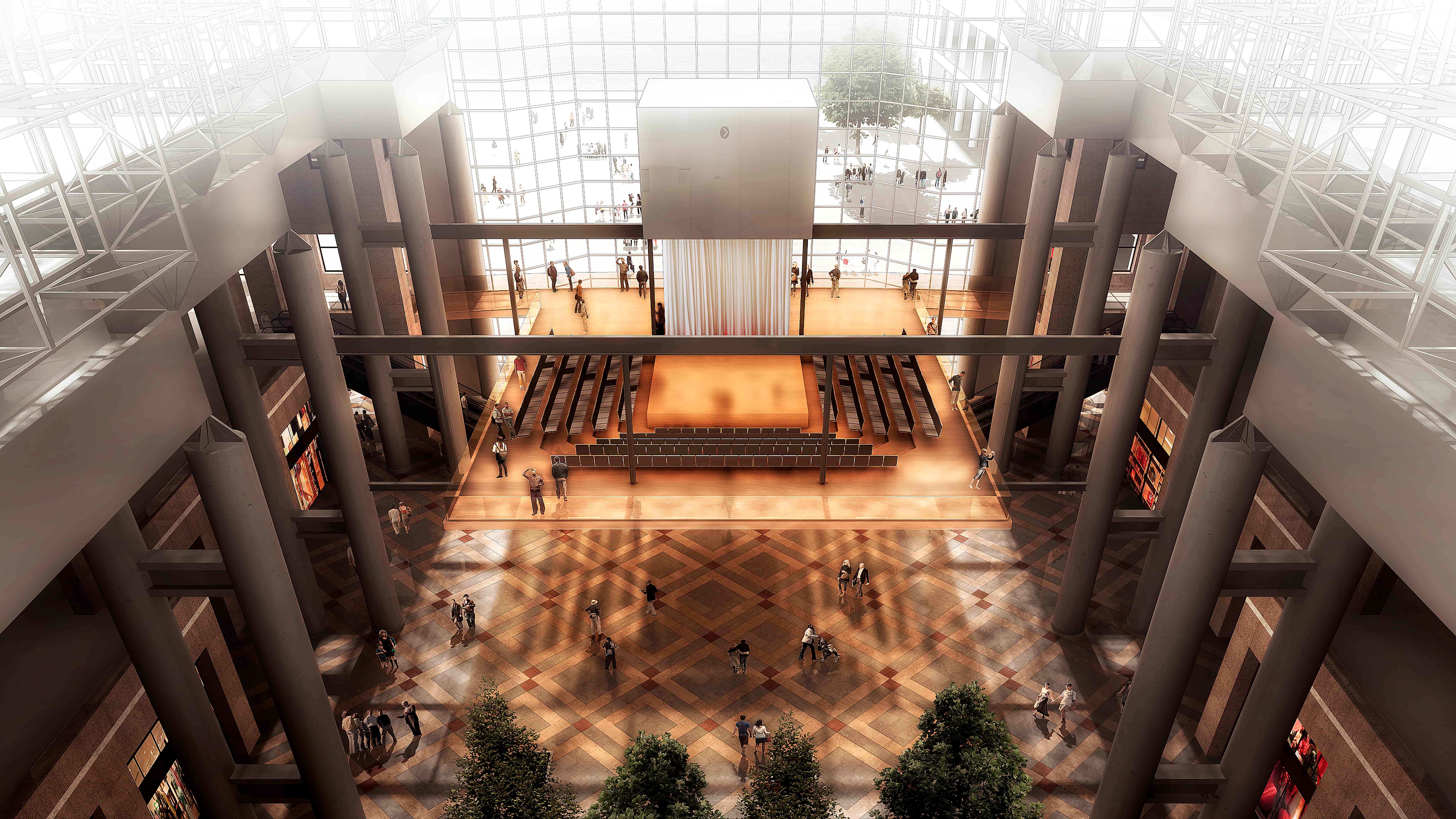 The Winter Garden’s existing grand stairs provide necessary connections, a theater of informal meeting functions, views to the Winter Garden and its occupants, and an important venue for public activities.