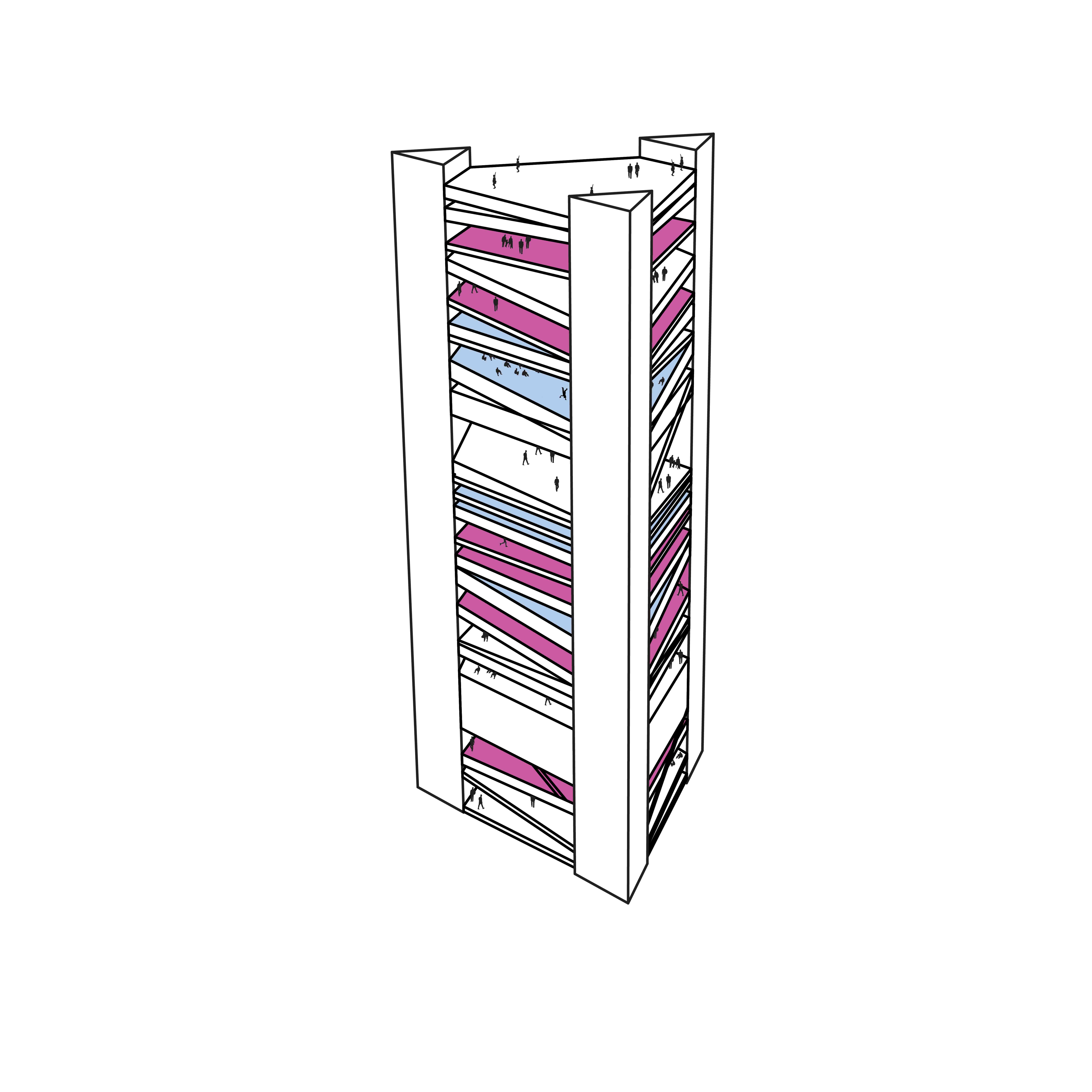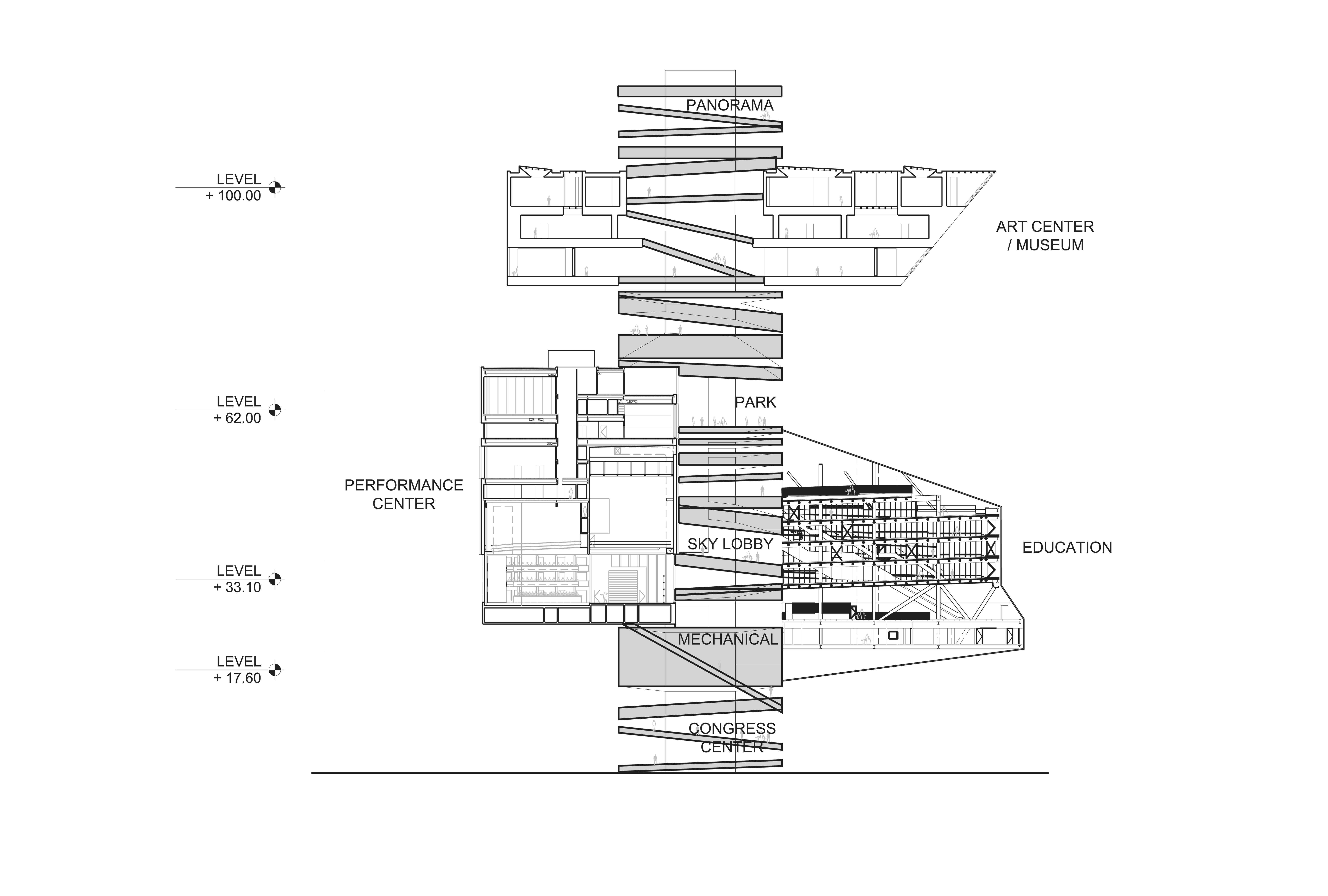 Of the cultural programs, REX “designed” the arts magnet school and congress center to provide the backbone for the Tower itself. Elevators, fire stairs, and MEP risers form the Tower of Culture’s three structural cores. A “waterfall” of structural plates forms the auditoria of the arts magnet school and the congress center, while also serving as a spiral of slow, meandering circulation.