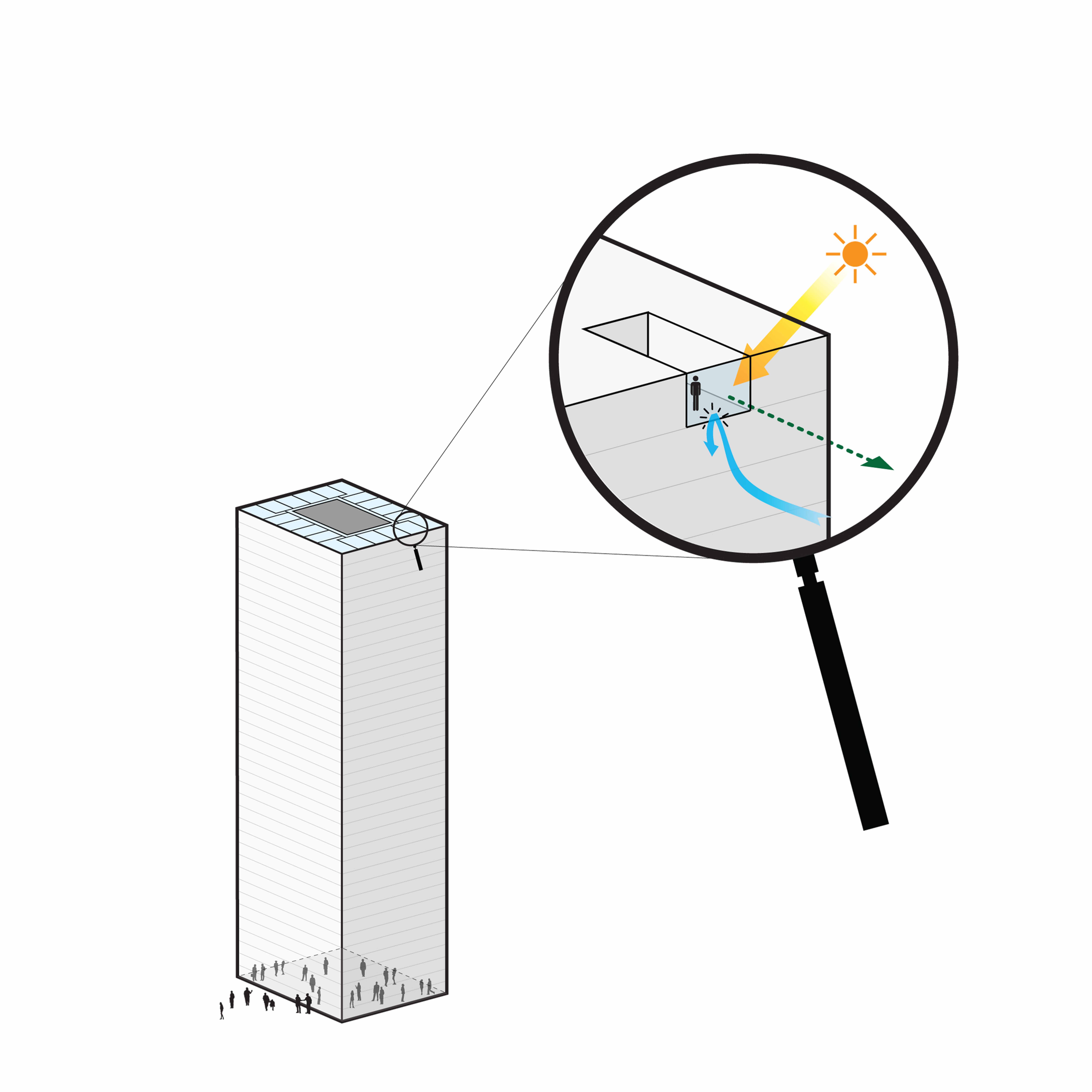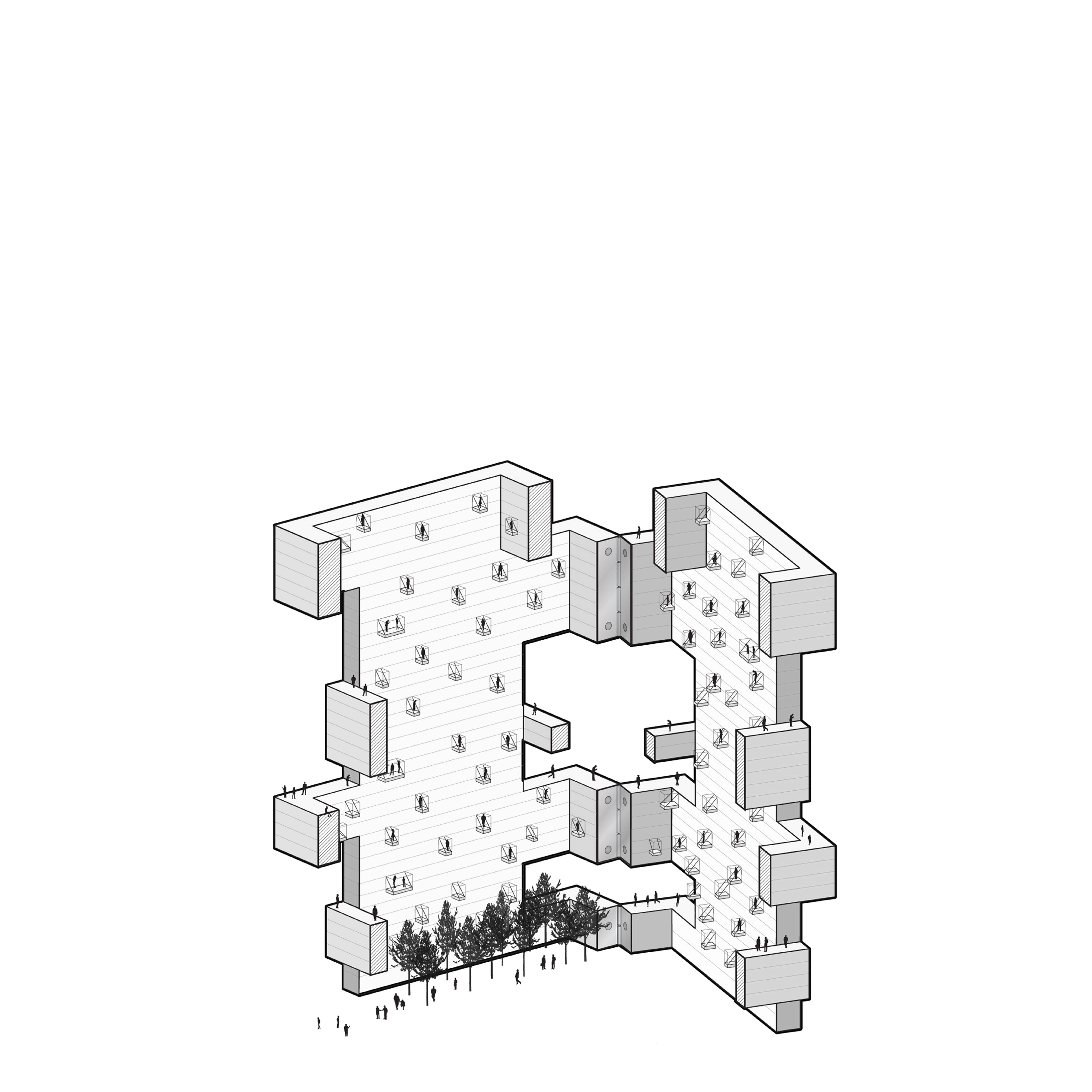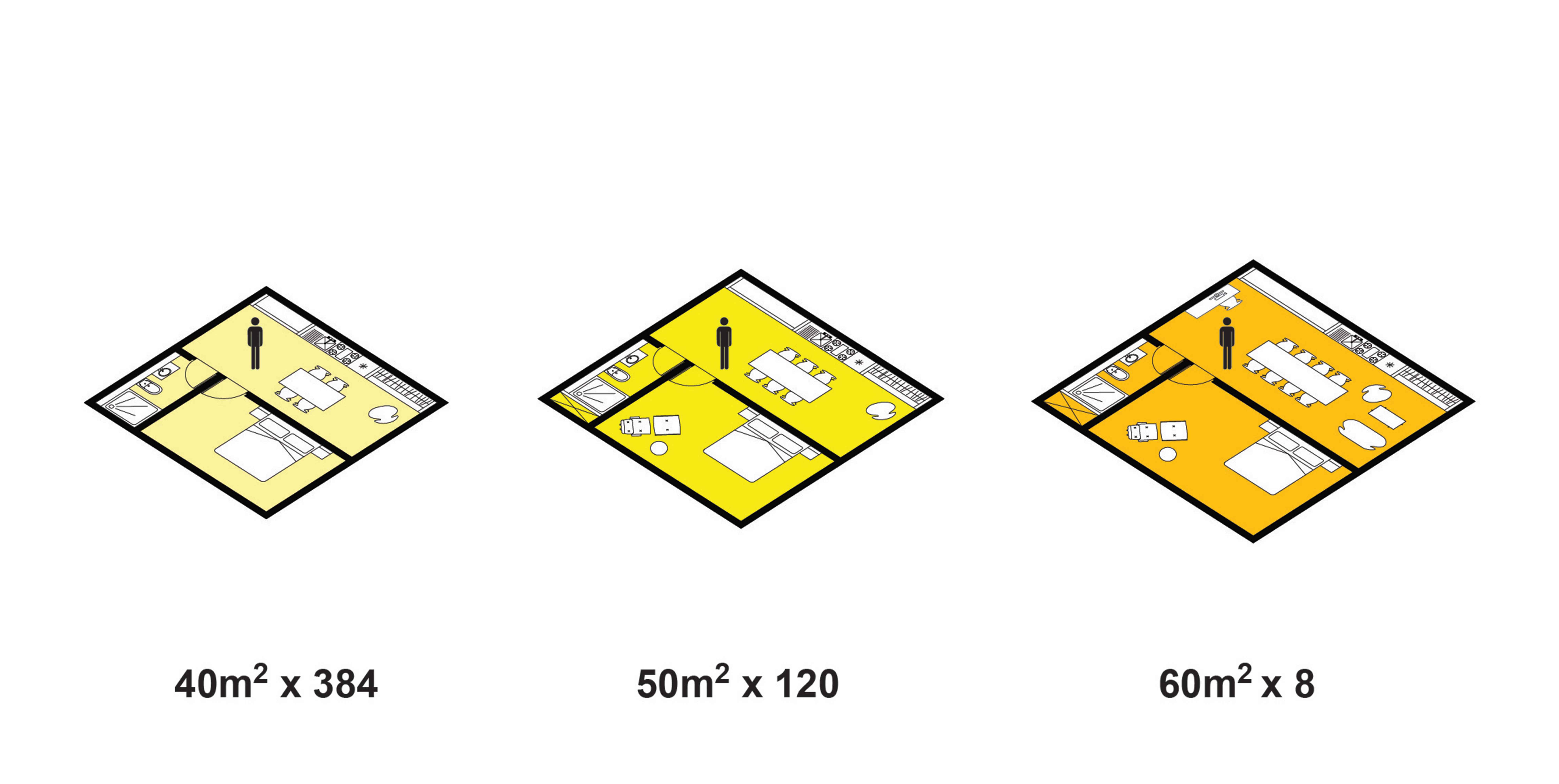 In a standard housing tower, 40 m² to 60 m² units would create poorly dimensioned and oppressive residences, offering constrained views, little daylight, and poor ventilation, and community would be limited to activities at the tower’s base.