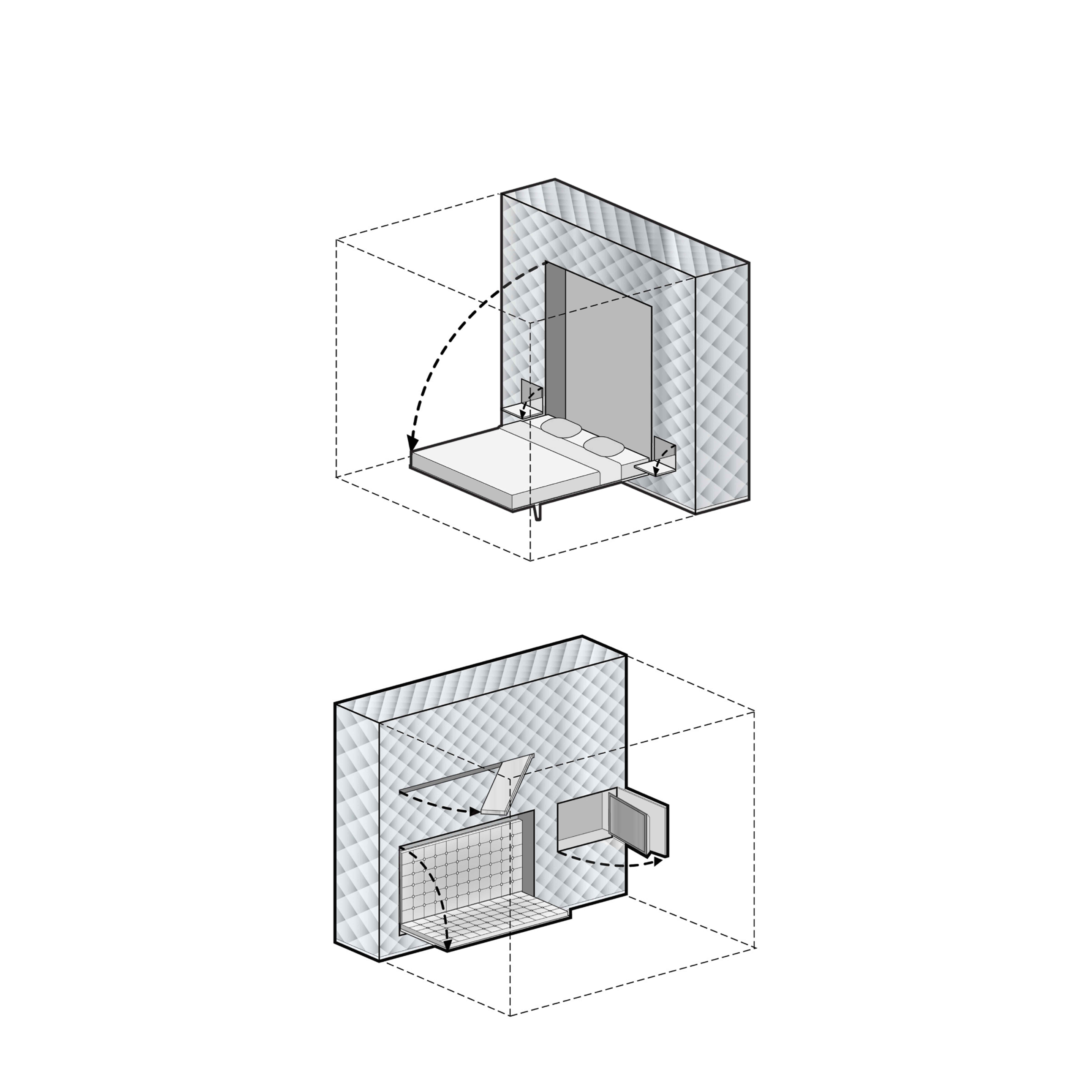 A movable wall—using standard compact shelving technology—shifts within the unit to define a bedroom (adjacent to the bathroom) or a living room (adjacent to the kitchen).