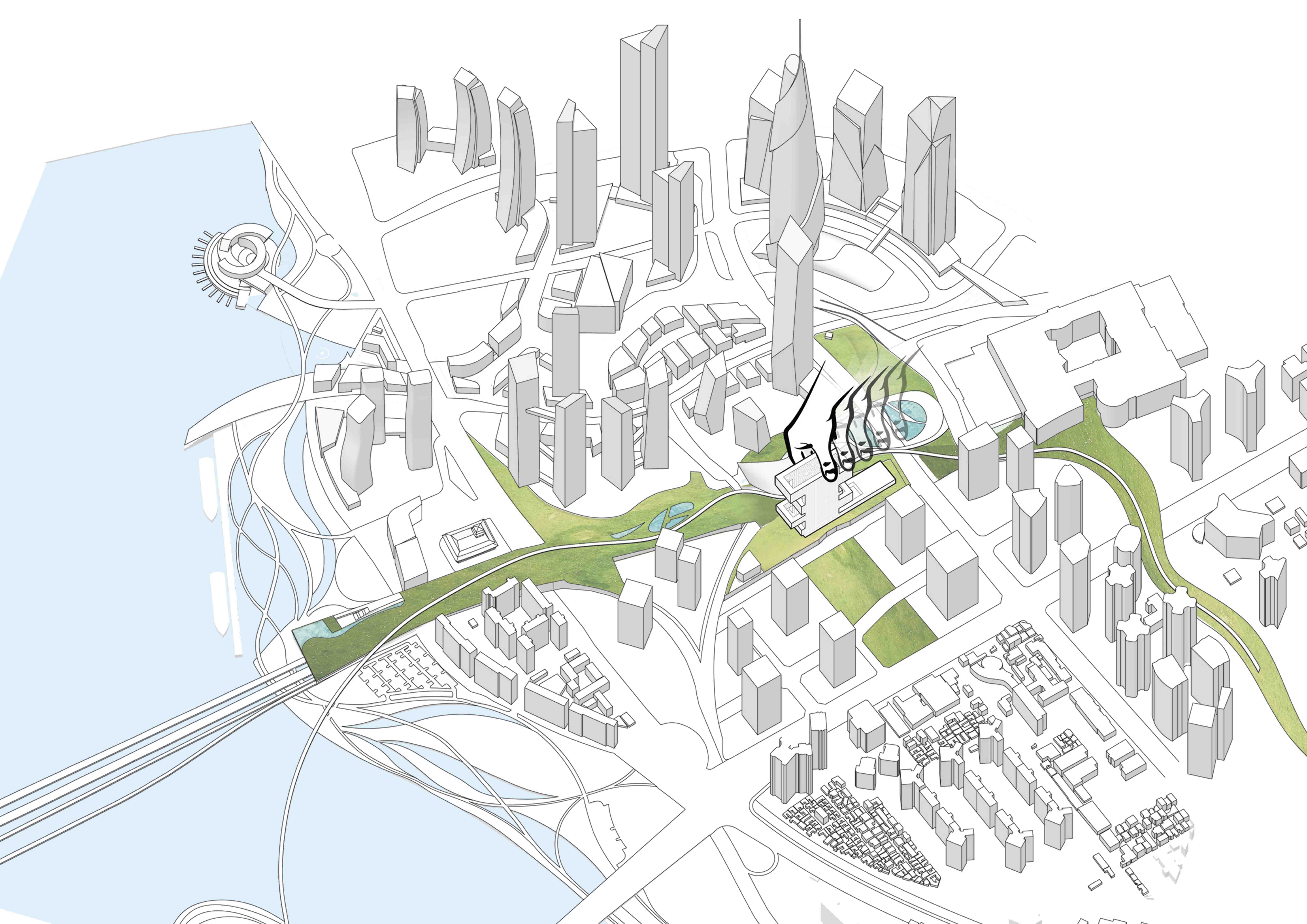 Block R6 is a narrow parcel bounded by the planned Mountain Park—including Children’s Interactive Spray Park, Rail Road Museum, Outdoor Amphitheater, and Yongsan Station Esplanade—and the central park of the planned development Zone B3, adjacent to Hangang-ro. By placing the building to the south of Block R6, all units command great views and the building forms a gateway to YIBD from Hangang-ro.